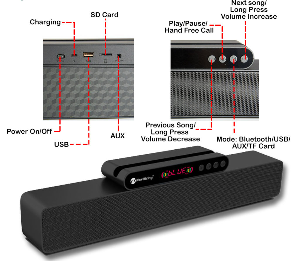 ■ multiple functions: wireless play/ FM radio/ USB drive/ hands free call/ TF card /aux input/ TWS connection/ led display