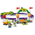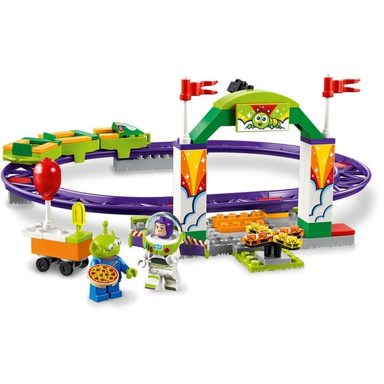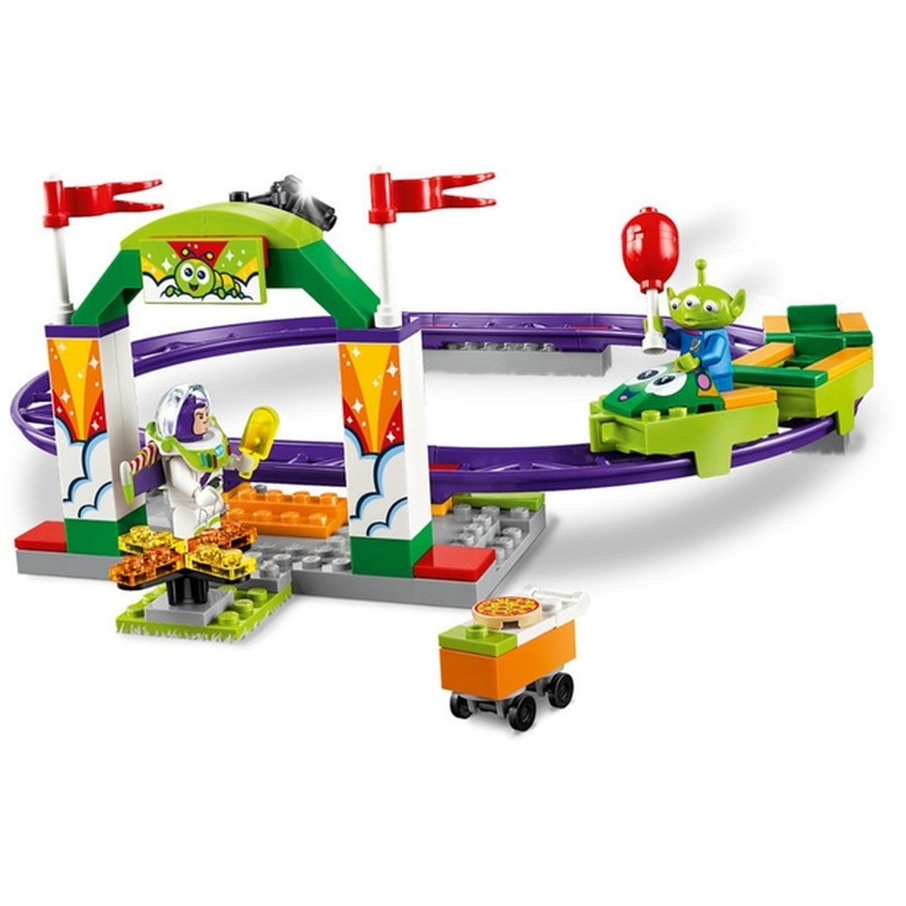 - Features a roller coaster track with a large entrance arch, flags, camera, spinning turnstile, 6 purple track sections and a special Starter Brick baseplate to get youngsters building and playing quickly with LEGO bricks in a Disney Pixar Toy Story 4 world.