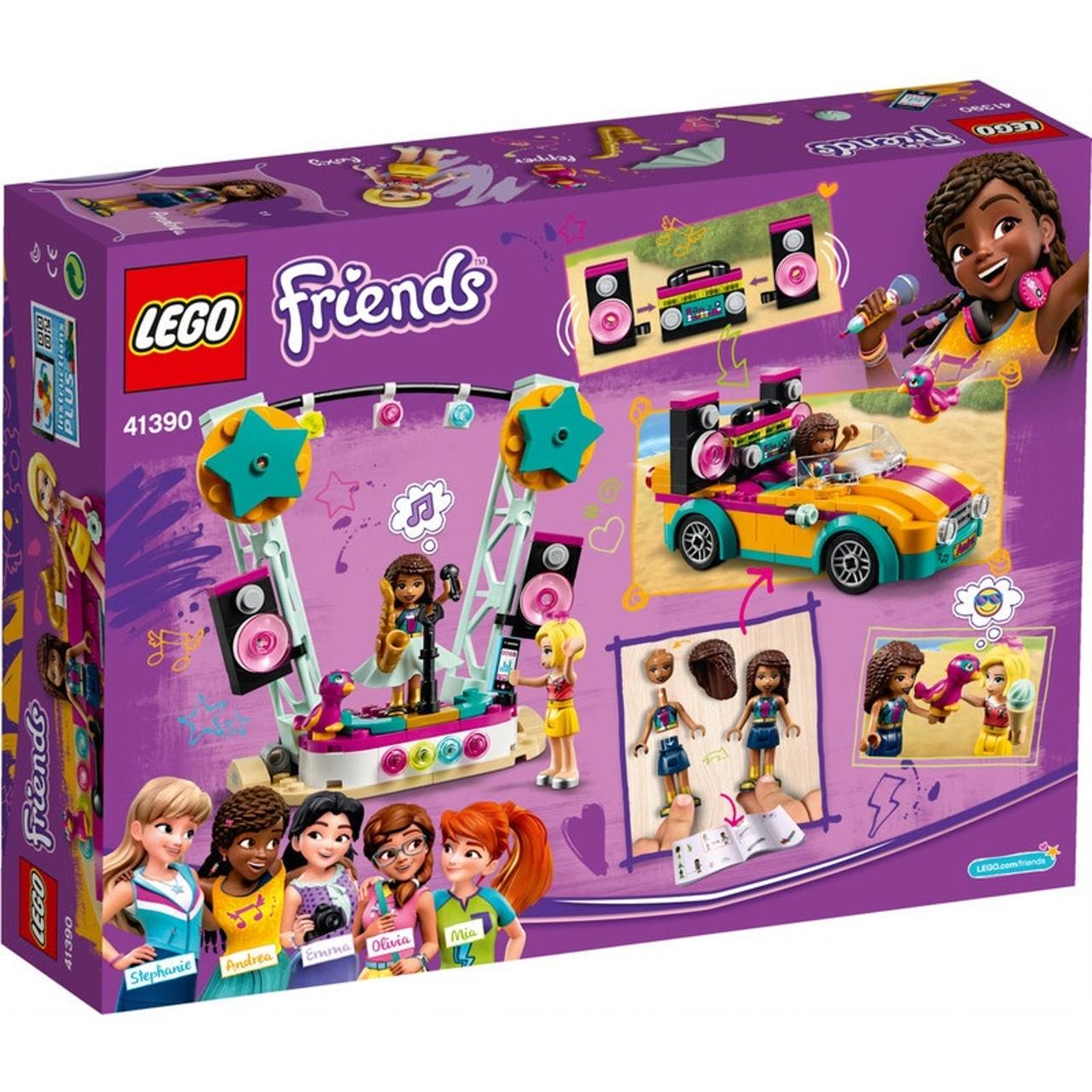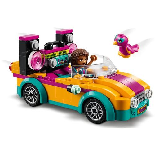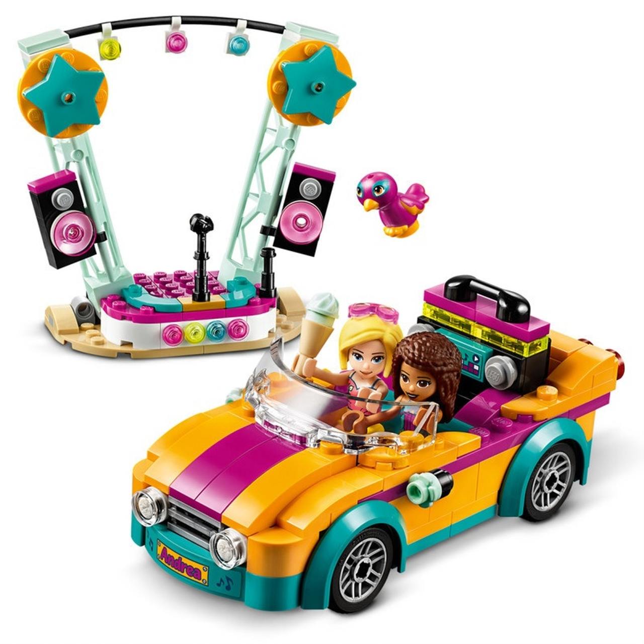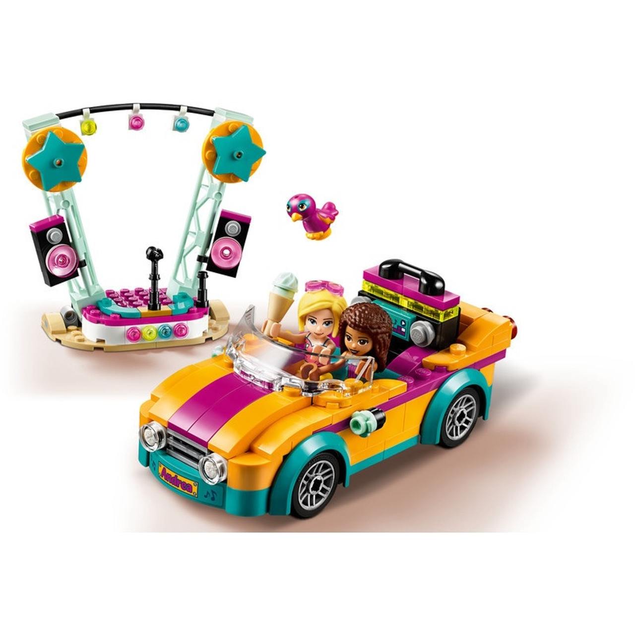 - Inside the box you'll find everything kids need to build a cool open-top LEGO car with a LEGO boombox. There are also 2 mini-dolls, a parrot figure and a toy stage on which LEGO Friends pop star Andrea performs.