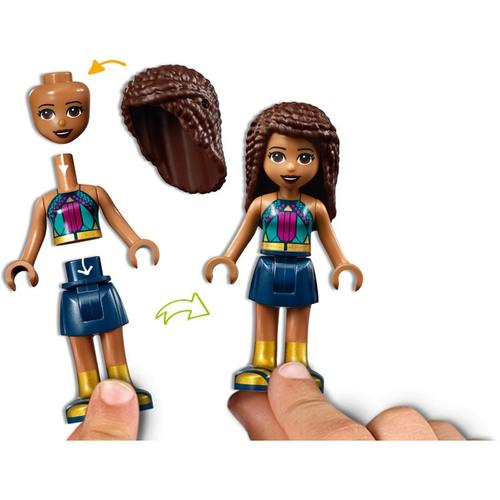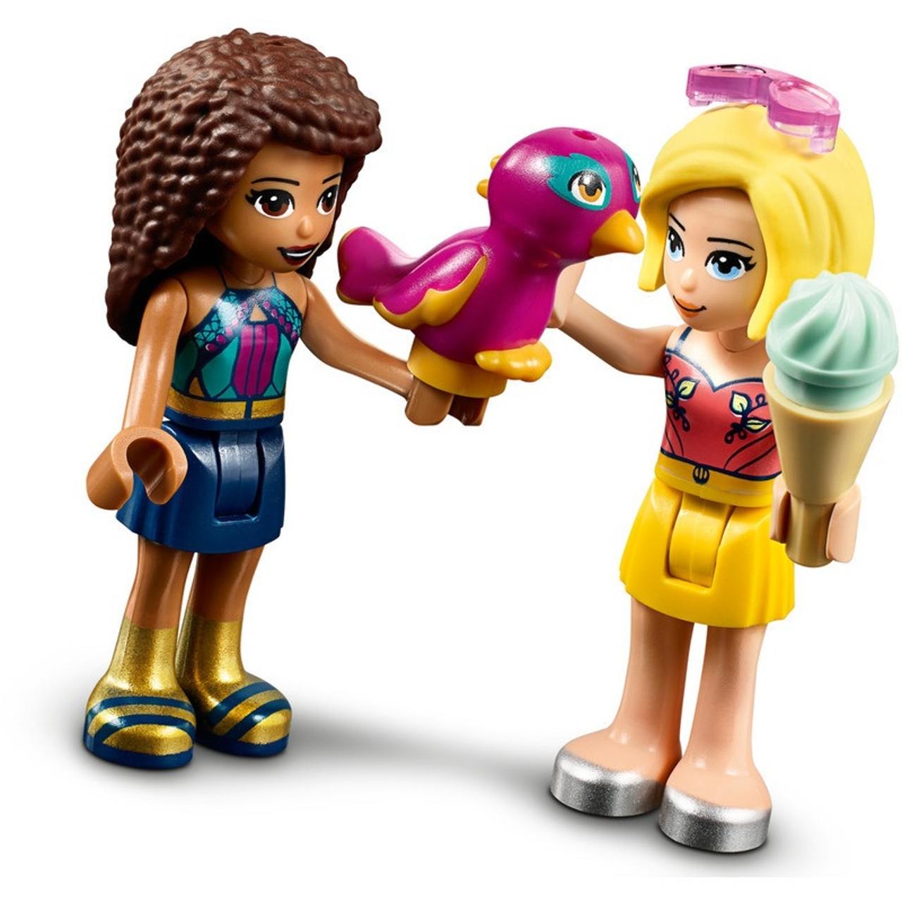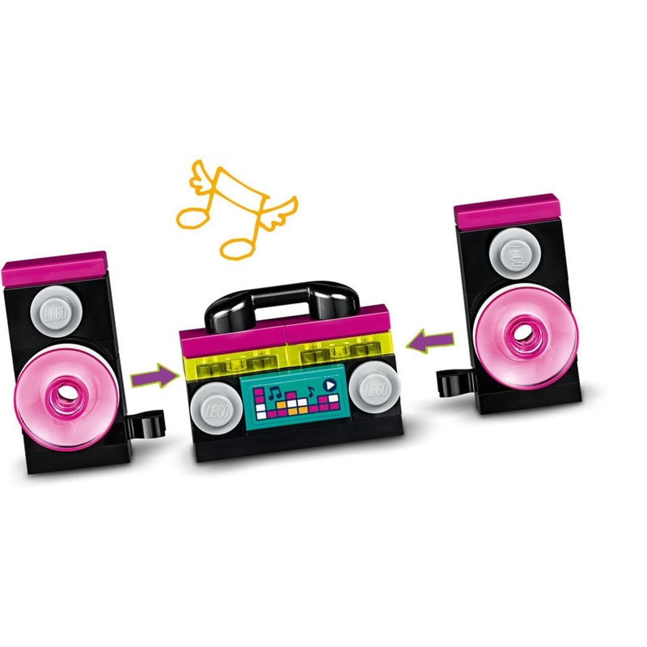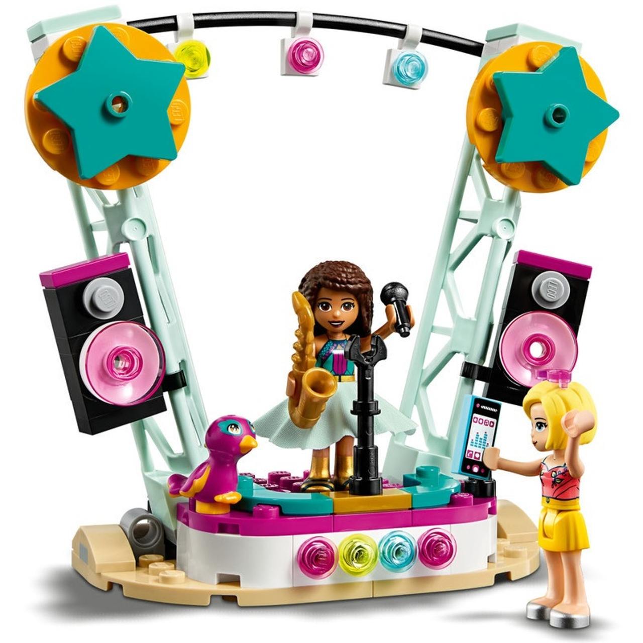 - Inside the box you'll find everything kids need to build a cool open-top LEGO car with a LEGO boombox. There are also 2 mini-dolls, a parrot figure and a toy stage on which LEGO Friends pop star Andrea performs.