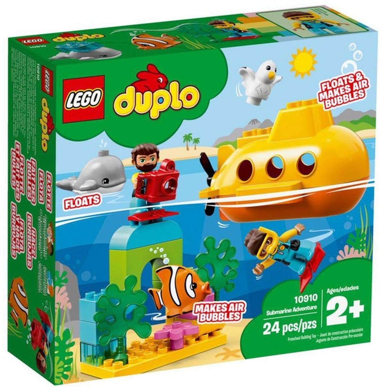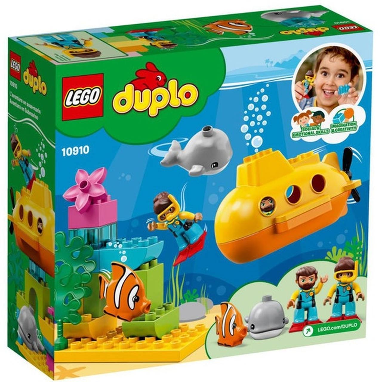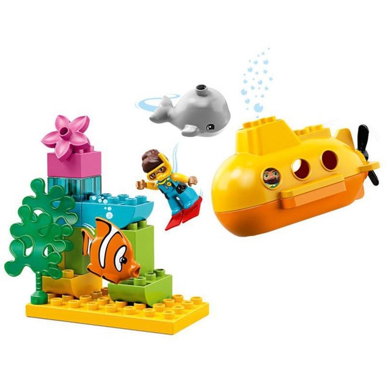 - LEGO DUPLO Submarine Adventure features a brightly colored toy submarine and a fish, both of which produce bubbles when immersed underwater, and a buildable arch with seaweed.