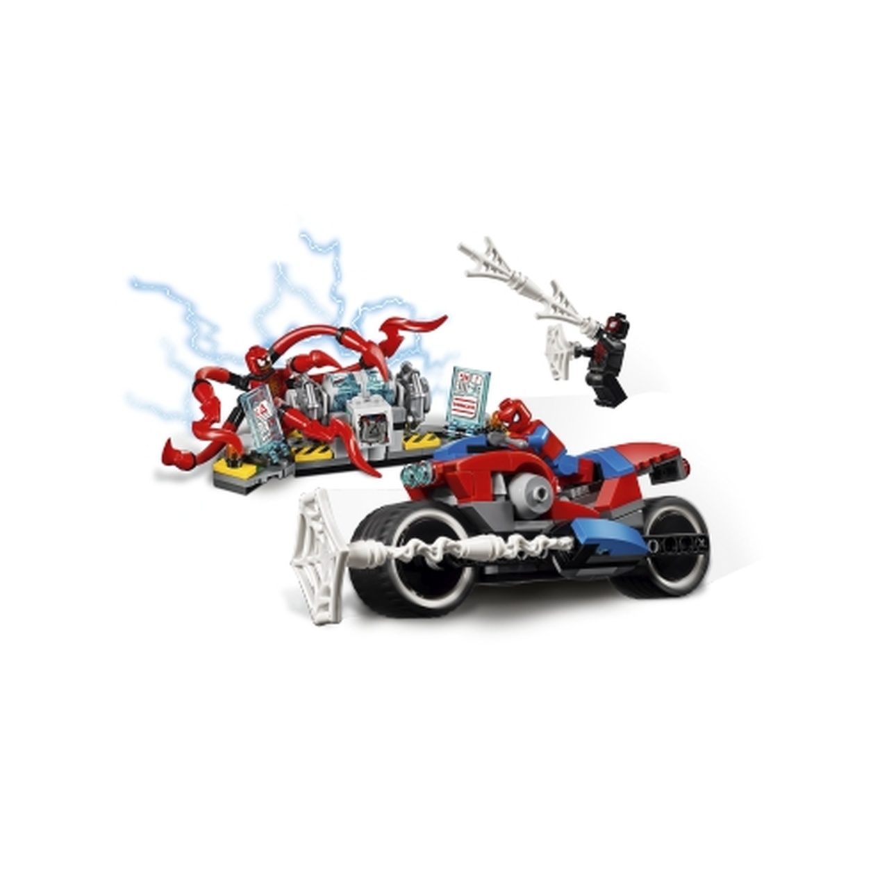 Speed through New York City streets and help Spider-Man and Miles Morales thwart evil Carnage's mission to blow up the power generator in LEGO Marvel Spider-Man 76113 Spider-Man Bike Rescue. This action-packed construction toy features a Spider-Man bike with a tech spider shooter and web gun (non-shooting), and a buildable power generator with an explode function. It also includes 3 LEGO minifigures, plus 9 assorted web elements to customize your builds, minifigures and weapons for creative play.