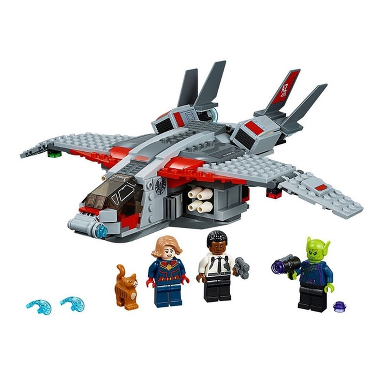 Team up with Captain Marvel and Nick Fury to save Goose the cat from Talos in LEGO Marvel 76127 Captain Marvel and The Skrull Attack. This action-packed construction toy features Nick Fury's Quinjet with an opening dual minifigure cockpit, adjustable wings, 2 flick-missile shooters that each shoot 4 missiles at once, and an opening rear compartment with space for Goose. This popular toy building set for kids includes 3 minifigures with weapons to recreate exciting scenes from the Captain Marvel movie and for endless imaginative play.