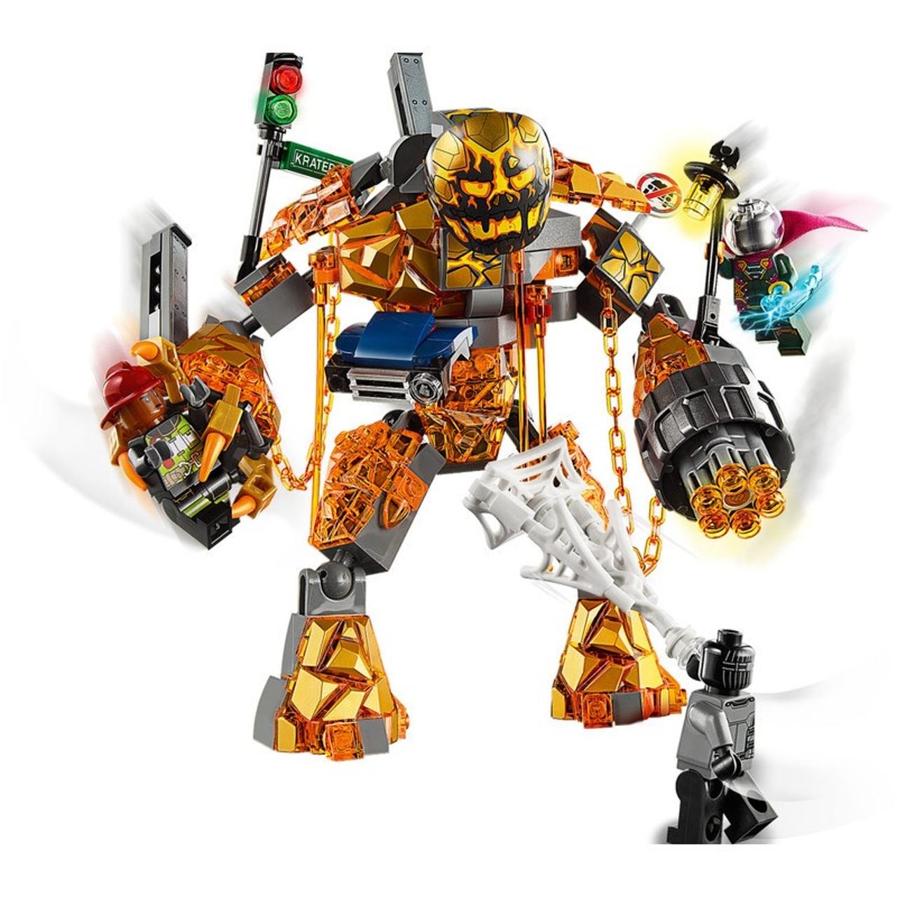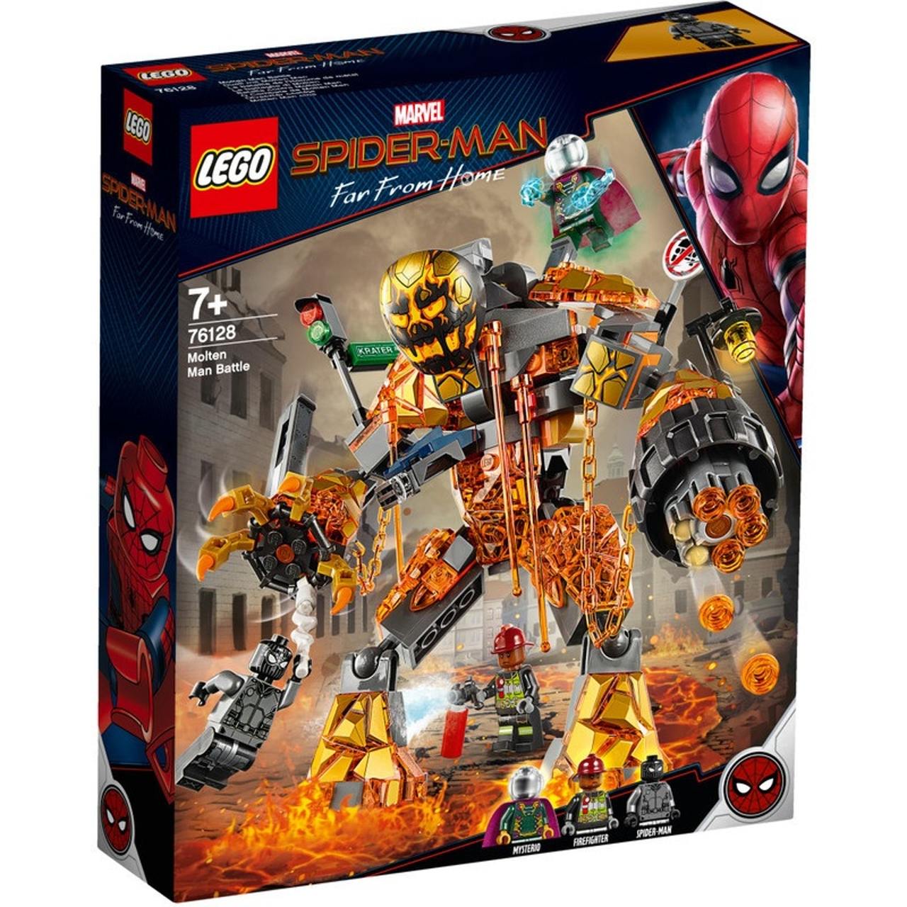 - Molten Man buildable figure features a posable head, arms and legs, gripping claw, 6-stud rapid shooter, buildable 'melting' objects including half a car, street lamp and traffic light, chain, melting lava stick elements and various attachment points for minifigures.