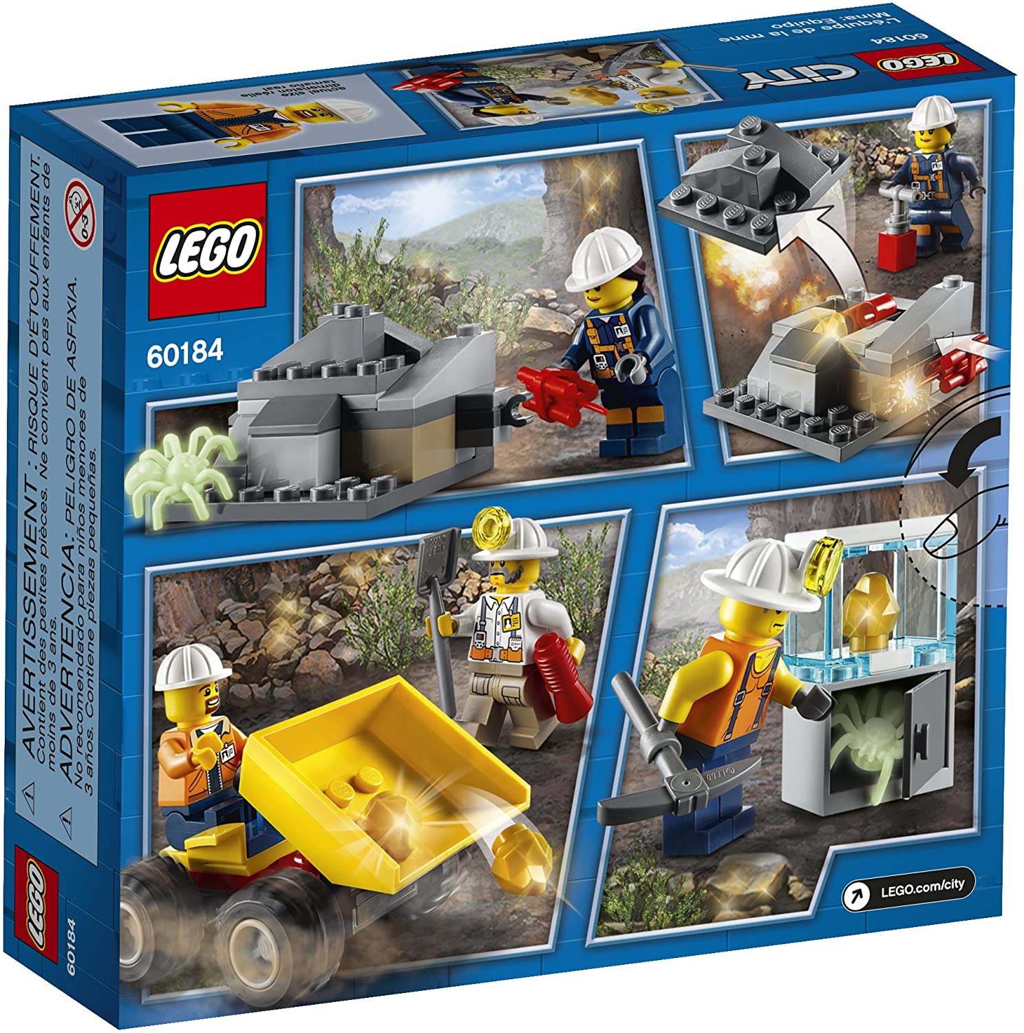Grab your hard hat and head out with the LEGO® City 60184 Mining Team to dig for gold! This fun mining toy, with mining figures and equipment features a rock pile with space for golden nugget and rock breakaway elements, as well as a dumper with tipping bed and space for a minifigure, plus a research station. Includes 4 minifigures and a glow-in-the-dark spider figure.