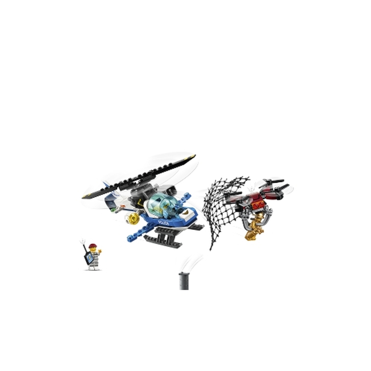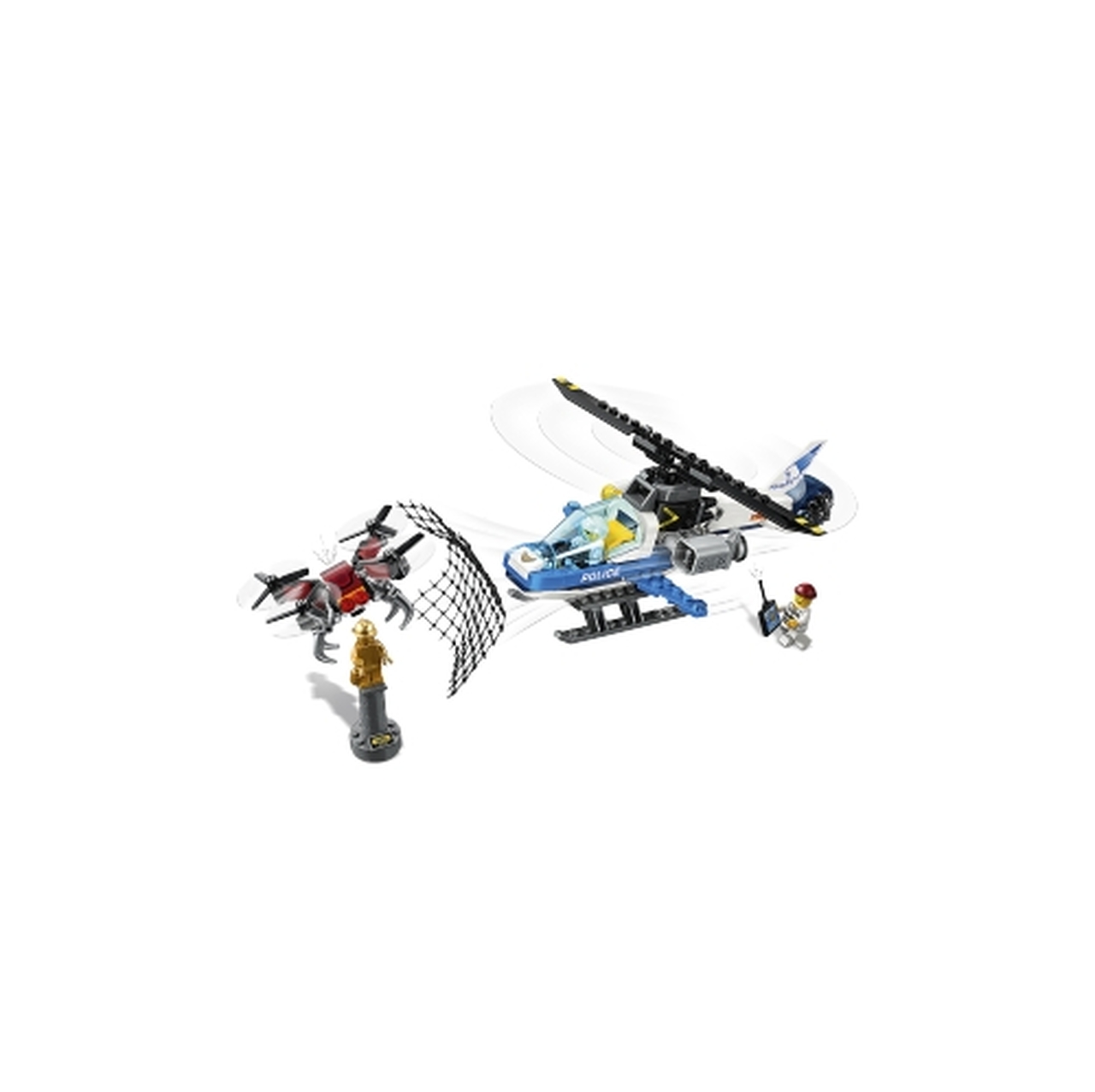 - Features a Sky Police helicopter with opening cockpit, spinning top rotor, searchlight and a firing net shooter, plus a buildable drone with spinning rotors and opening claws.