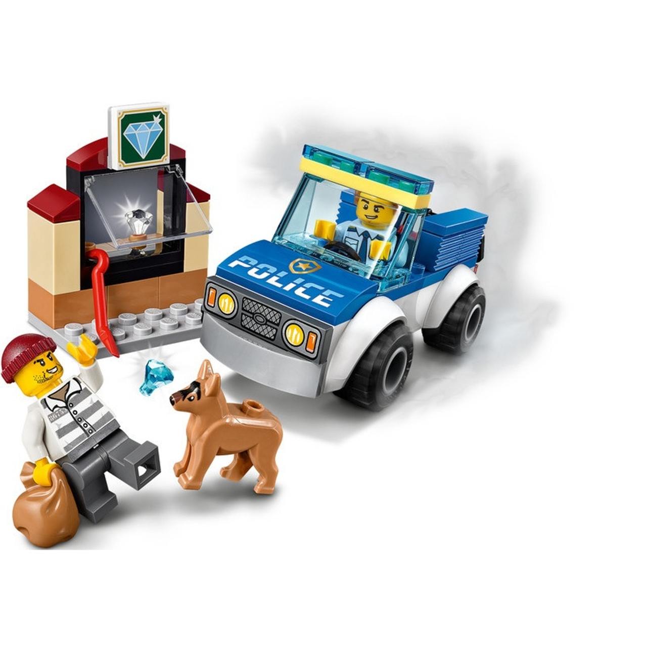- What's in the box? A cool toy police car with room for the police officer and his faithful police dog, a jewelry shop setting with 2 gems, and a crowbar-wielding crook with a sack for stashing his haul.