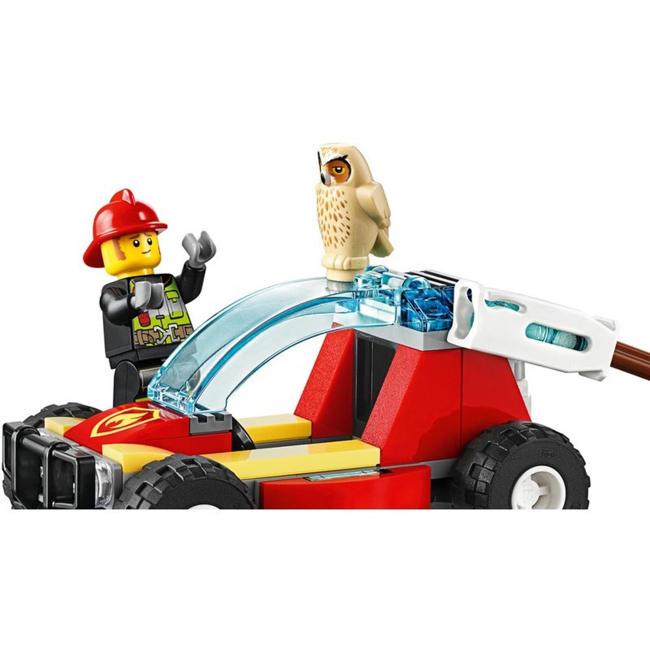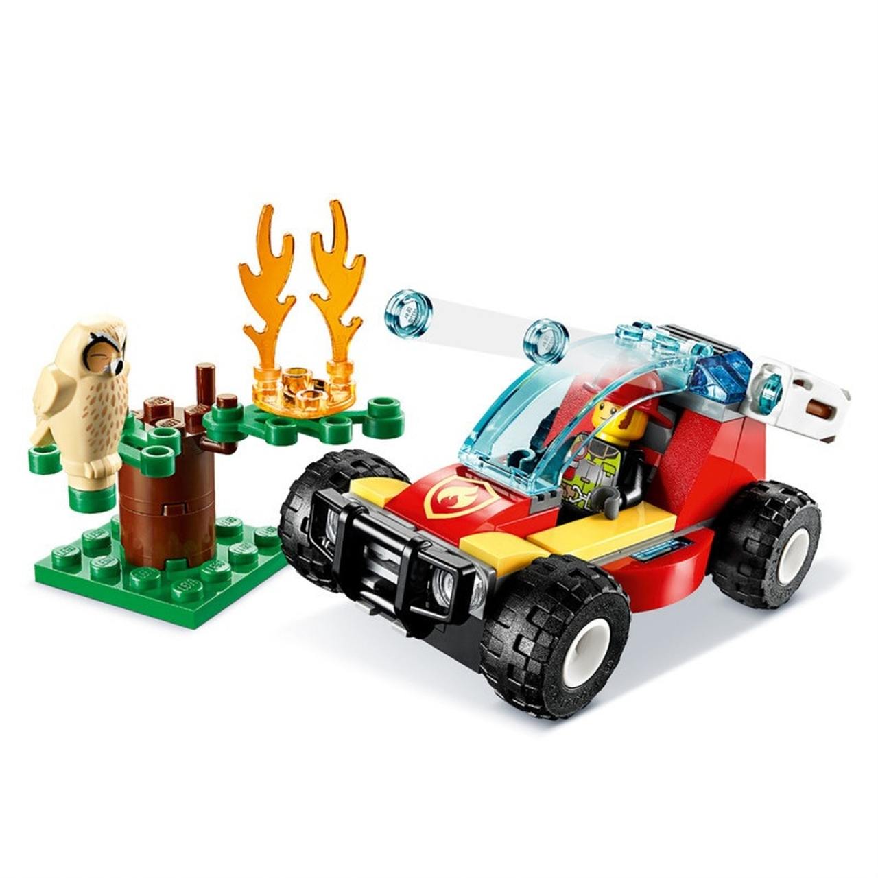 - What's in the box? This (60247) playset includes a cool buggy with a water cannon and room for the firefighter driver, a toy tree with flames and a sleepy owl figure. Provides plenty of opportunity for imaginative play.
