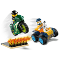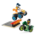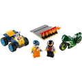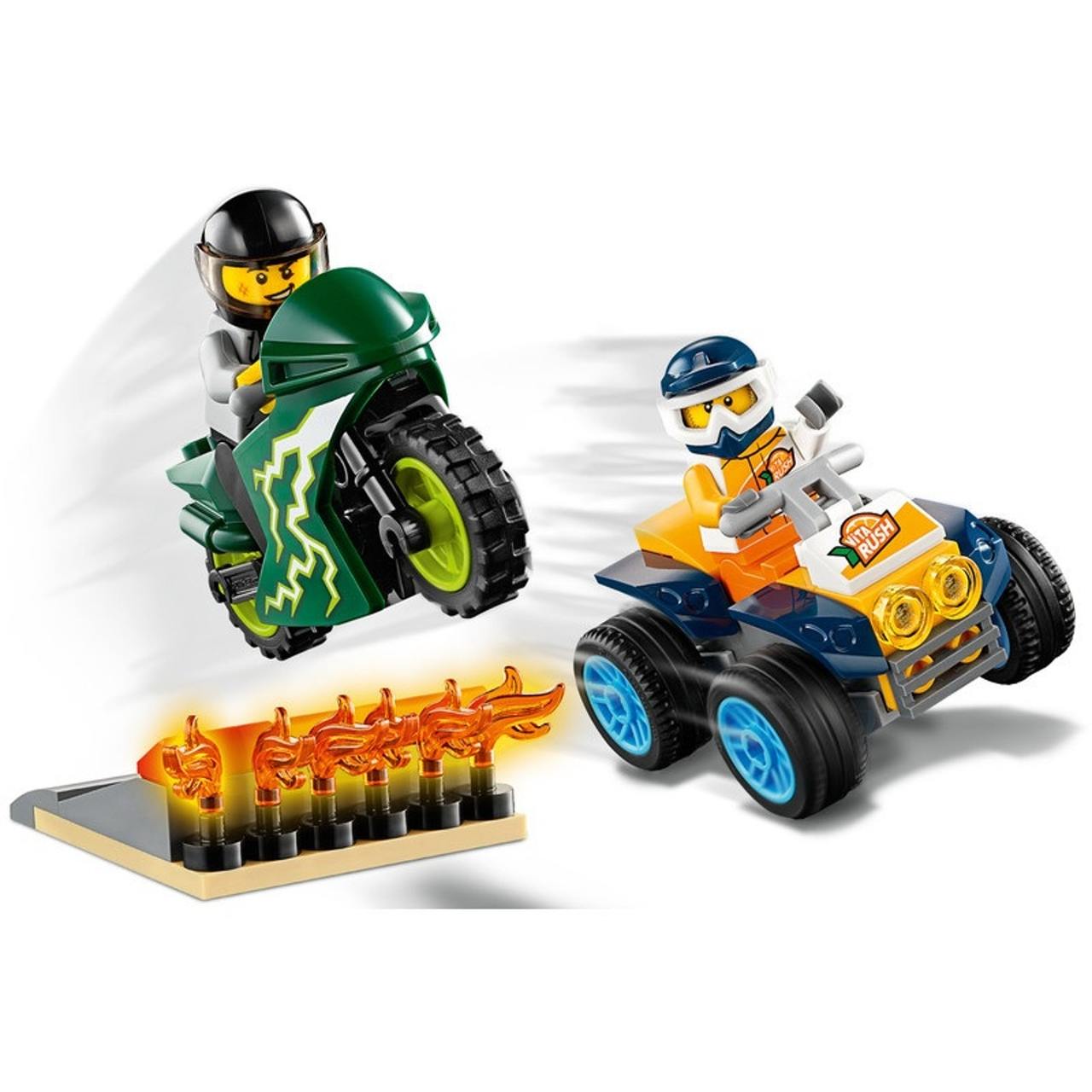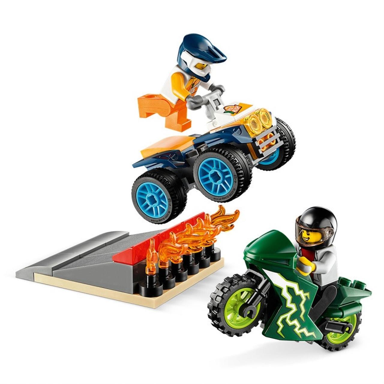 - What's in the box? A cool stunt ATV and motorcycle toy, 2 stunt driver minifigures with helmets, and a take-off ramp with flames. Everything a kid needs for action-packed, independent play.