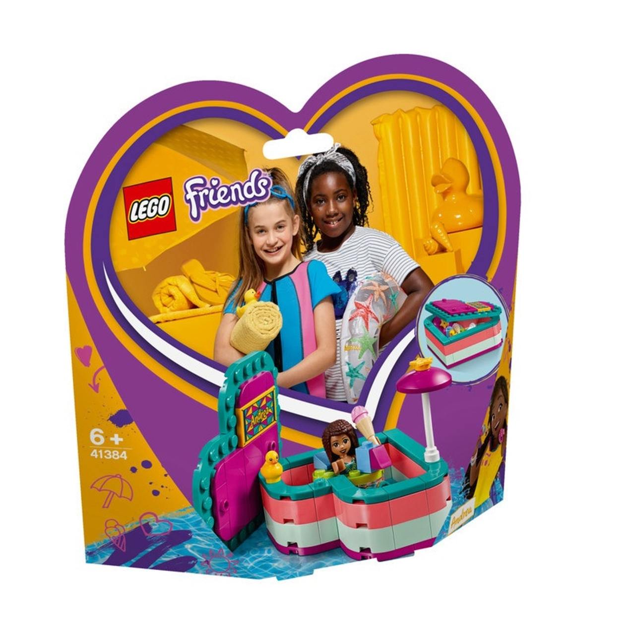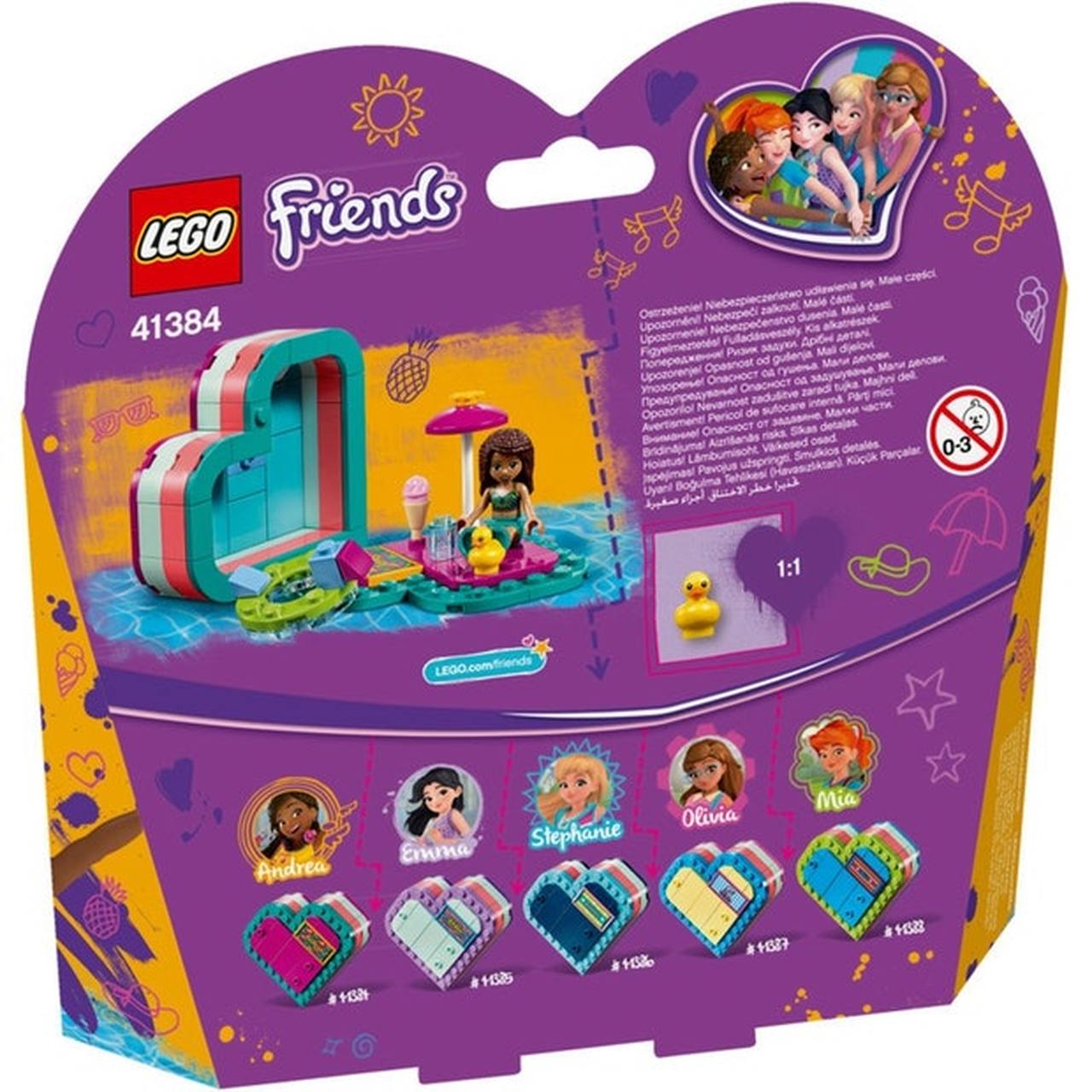 - LEGO Friends box includes an Andrea mini-doll figure and a rubber duck figure.