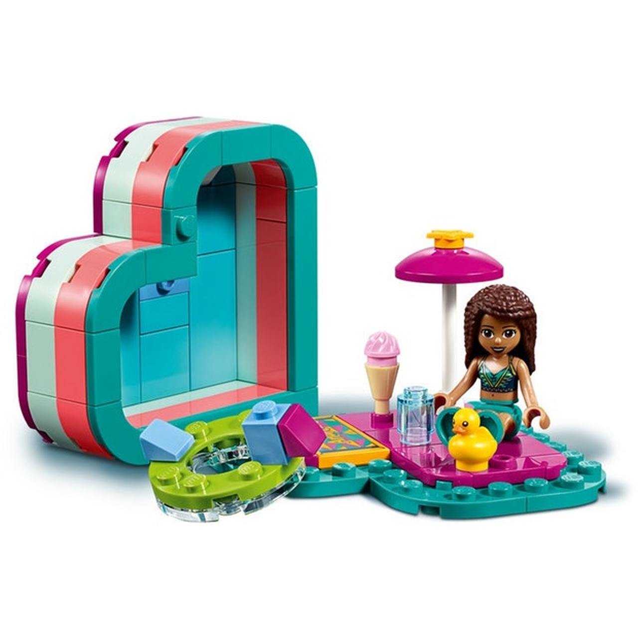 - LEGO Friends accessories in this set include a parasol, ice cream and a duck floatie.